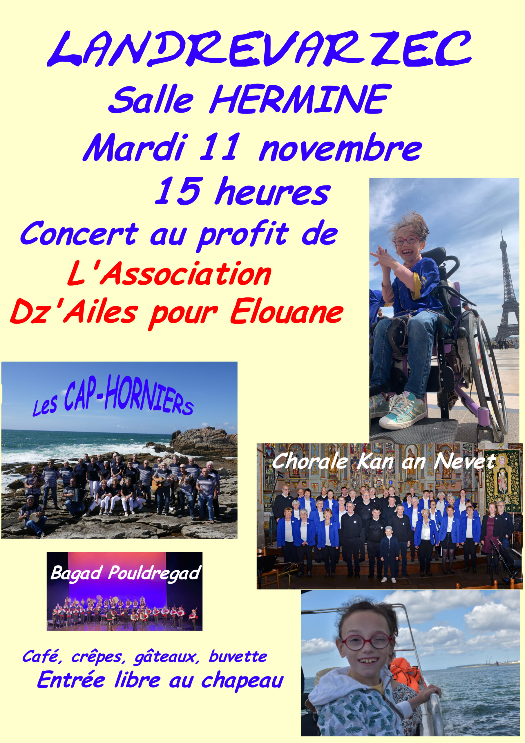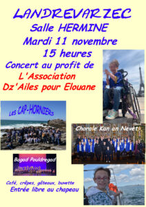 • Mardi 11 novembre dans la salle Hermine de Landrévarzec,                                                                                      Concert caritatif au profit de l’association « Des ailes pour Elouane »