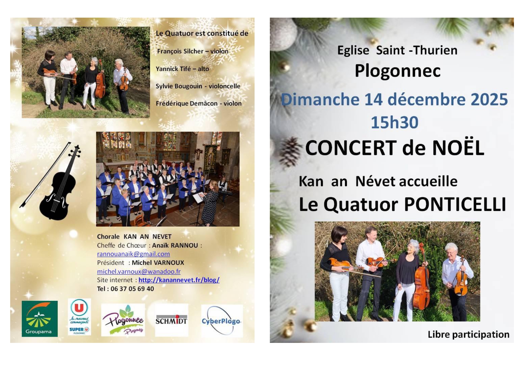 Concert de Noël dans l’église de Plogonnec le 14 décembre 2025 avec le Quatuor Ponticelli.